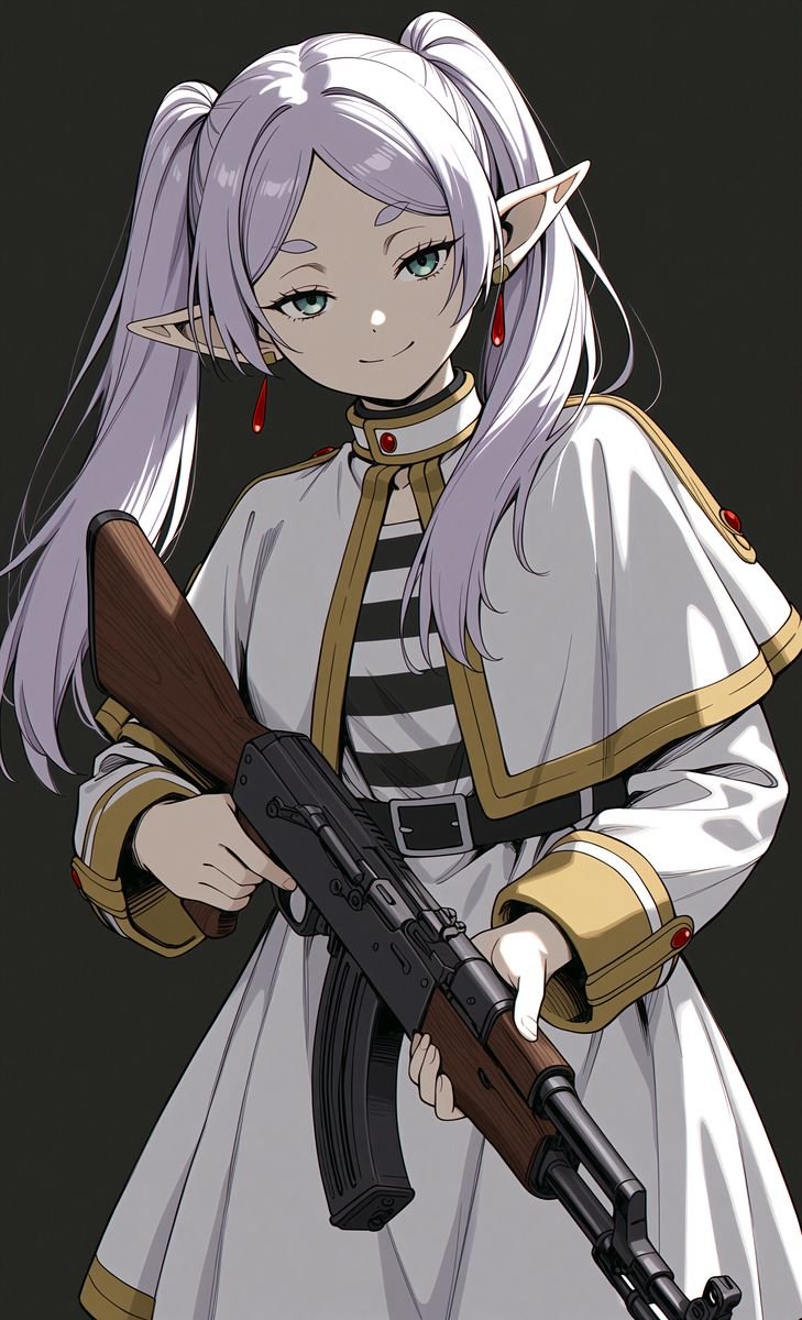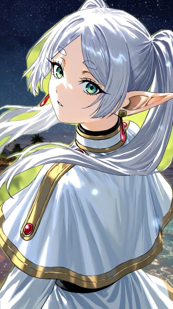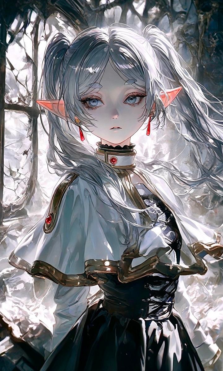 High-resolution Frieren portraits emphasize fine detail in hair, clothing, and environment. Soft lighting interacts with subtle textures. Backgrounds often feature distant landscapes or blurred interiors. The palette remains restrained, focusing on cool blues, pale golds, and muted grays. Composition stays centered and uncluttered.