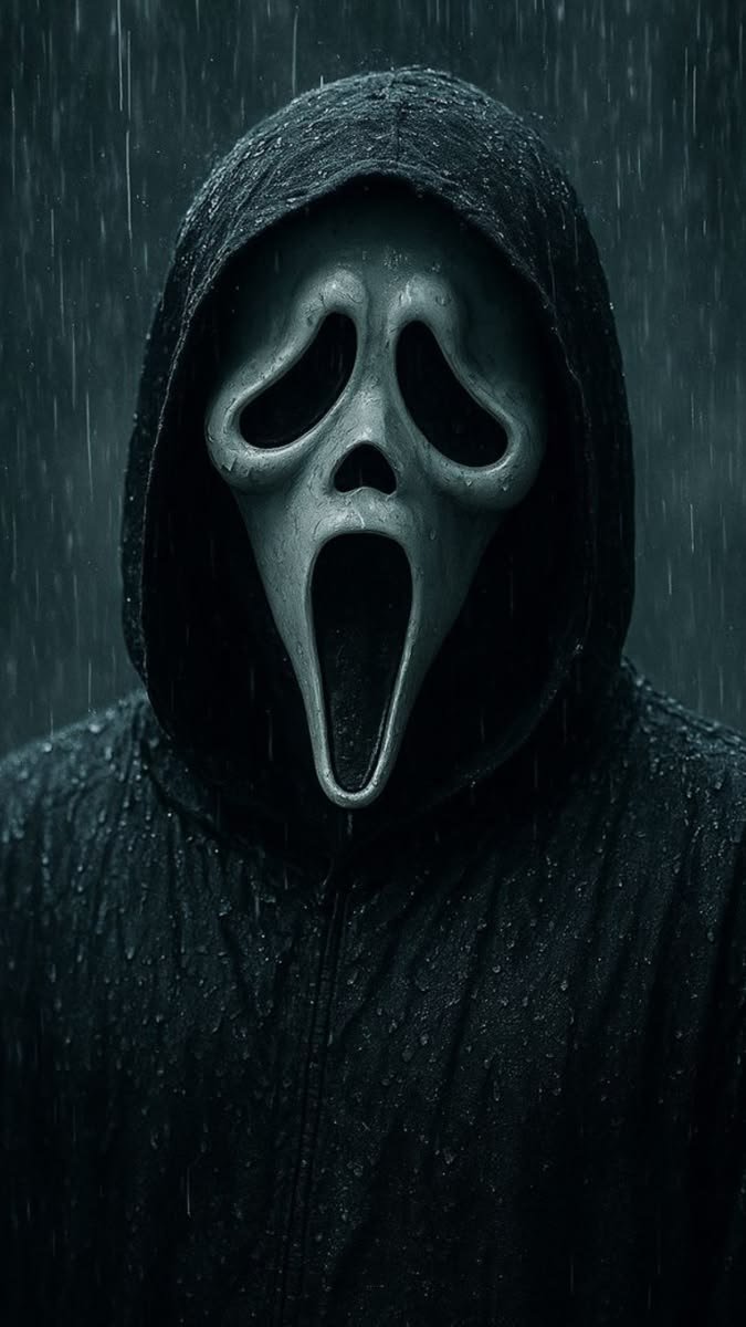 Soft shadows and high-contrast monochrome tones define this visual style. The Ghostface mask appears centered or slightly off-frame. Backgrounds remain minimal. Lighting often isolates the face. Subtle gradients create depth without clutter.